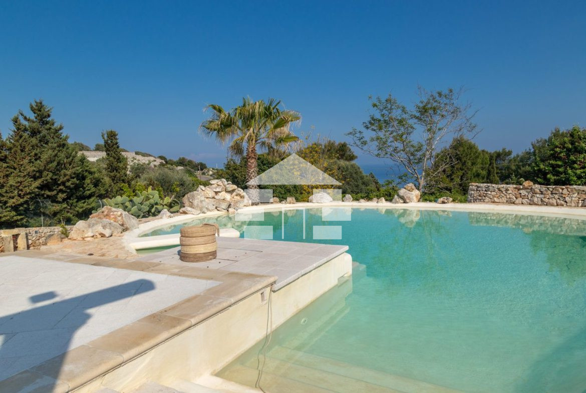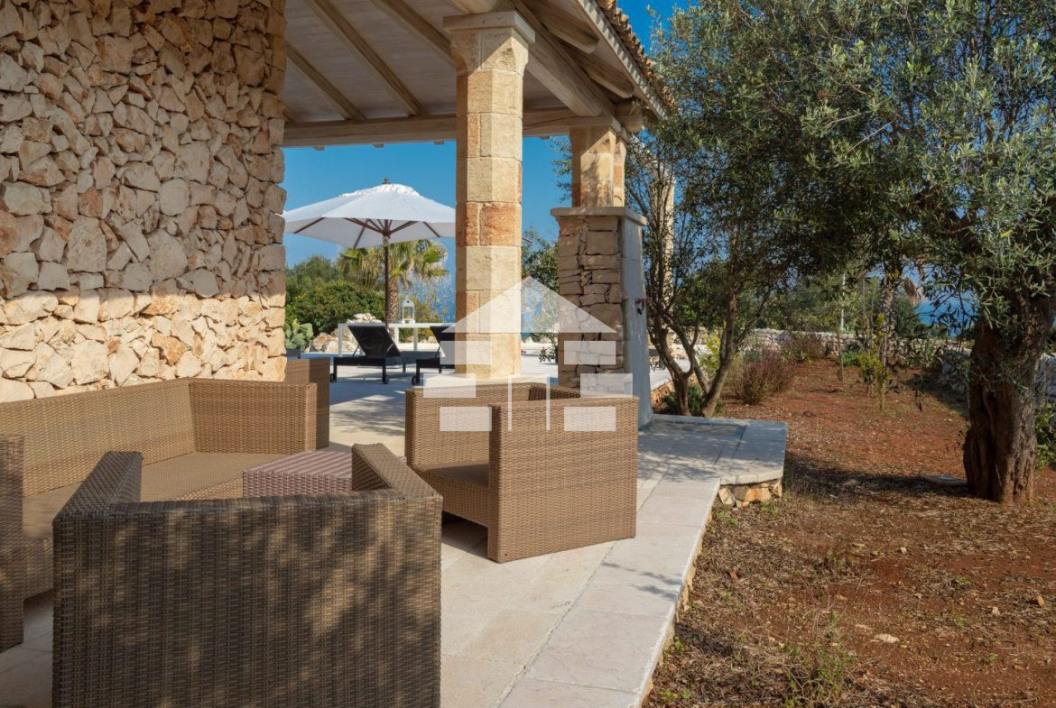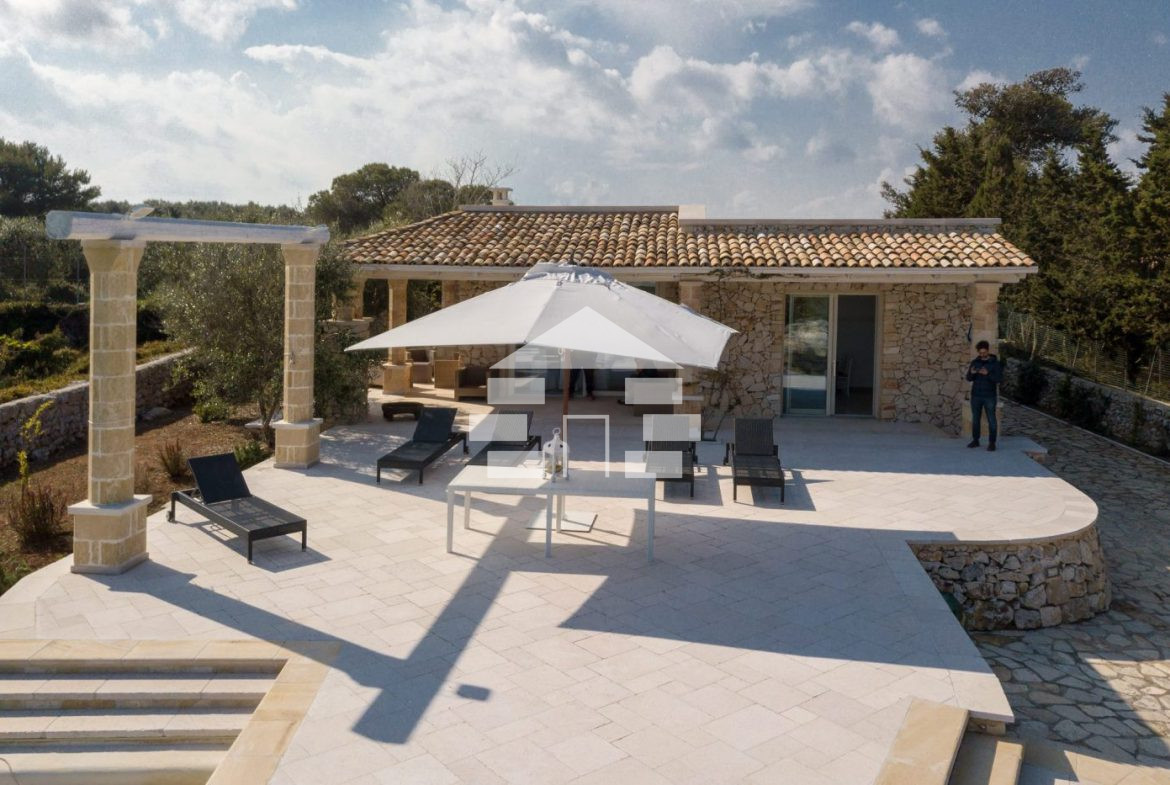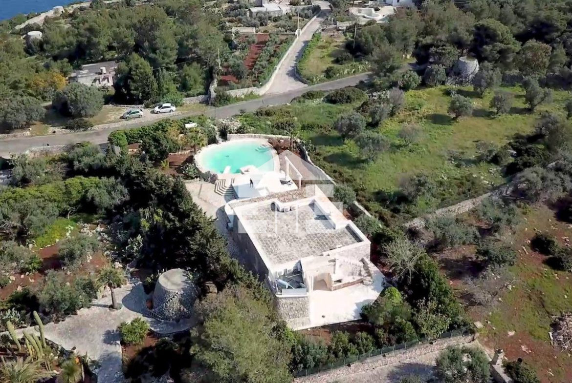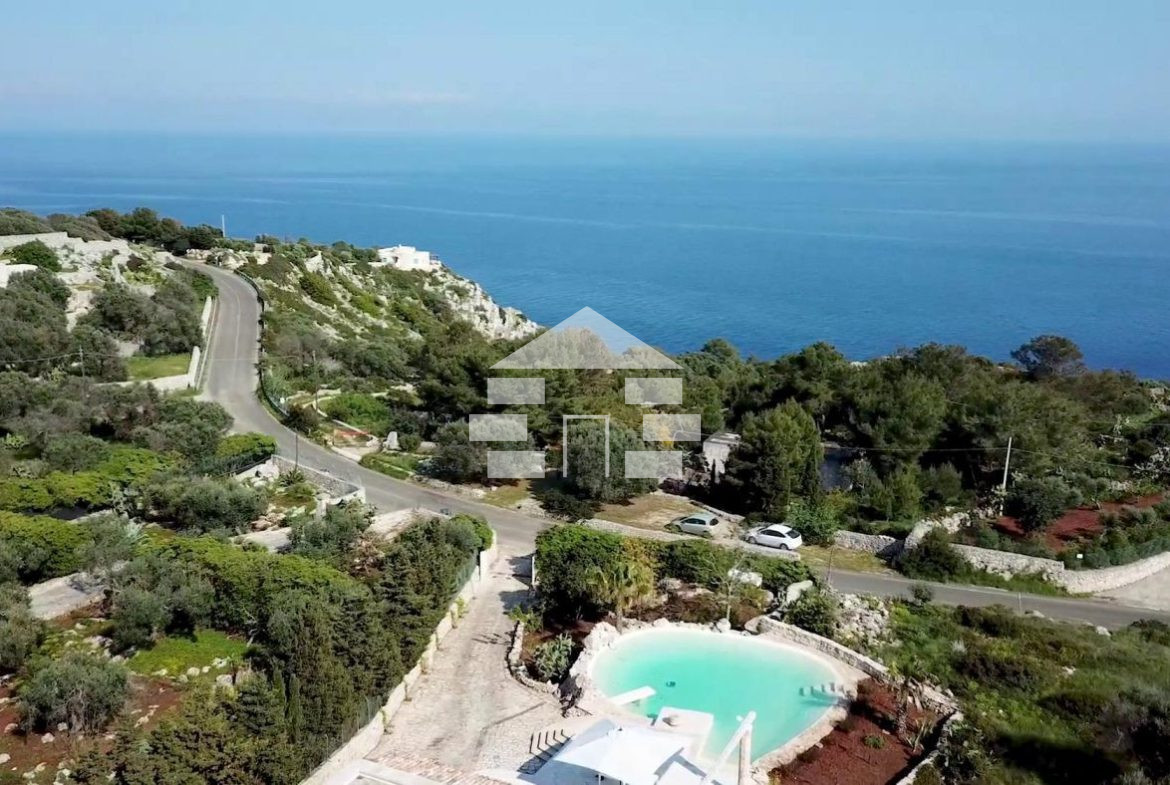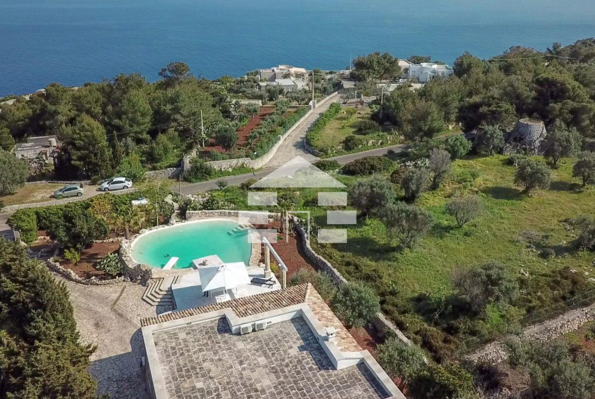 D’AMICO IMMOBILIARE vende Villa con Piscina vista mare di 150 metri quadri coperti, su un giardino di 1.200 metri quadri , caratterizzato dalla presenza di piante tipiche della macchia mediterranea quali, cespugli di mirti, fichi d’india, ulivi secolari, siepi, rosmarino , timo. La Villa è realizzata in pietra viva tipica del Salento, ed è composta da Soggiorno, 4 Camere da letto matrimoniali, 5 bagni, una cucina, un bagno esterno, e Porticati esterni dai quali ammirare la bellissima vista mare.