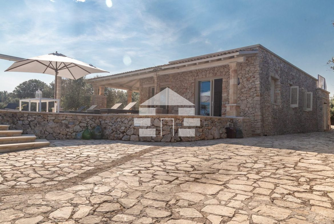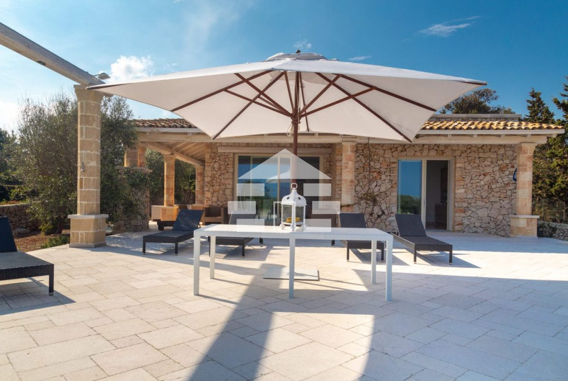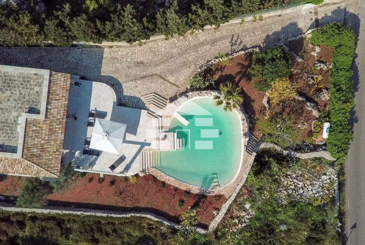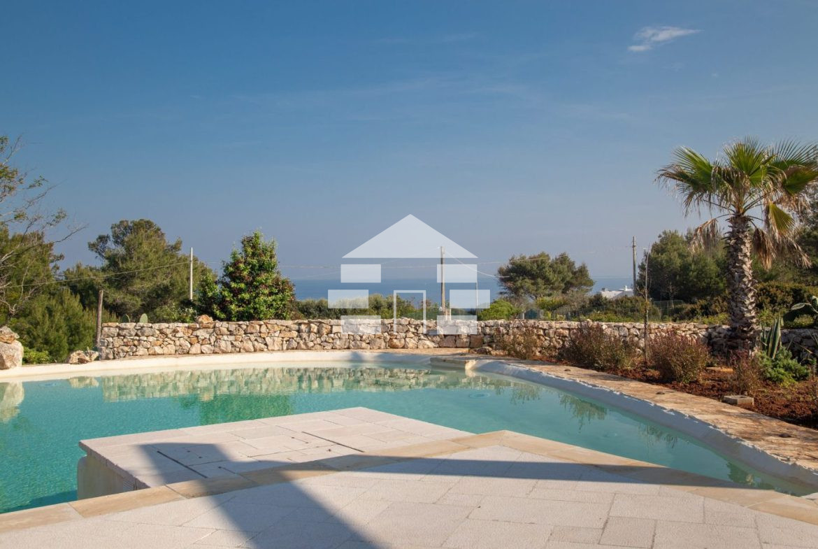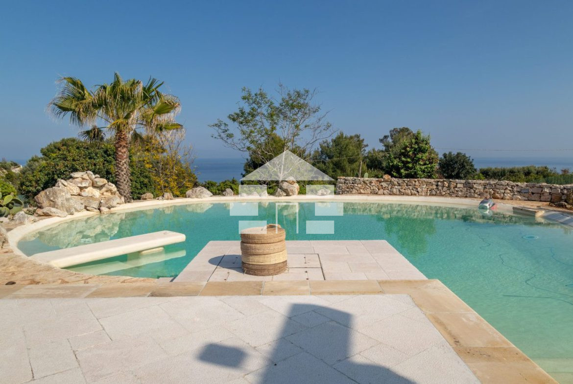 D’AMICO IMMOBILIARE vende Villa con Piscina vista mare di 150 metri quadri coperti, su un giardino di 1.200 metri quadri , caratterizzato dalla presenza di piante tipiche della macchia mediterranea quali, cespugli di mirti, fichi d’india, ulivi secolari, siepi, rosmarino , timo. La Villa è realizzata in pietra viva tipica del Salento, ed è composta da Soggiorno, 4 Camere da letto matrimoniali, 5 bagni, una cucina, un bagno esterno, e Porticati esterni dai quali ammirare la bellissima vista mare.